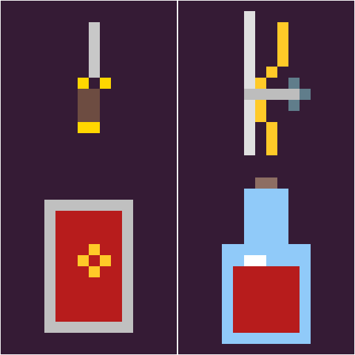 64 pixel weapons across 4 rarity tiers: common (steel), uncommon (enchanted), rare (legendary), epic (mythic).